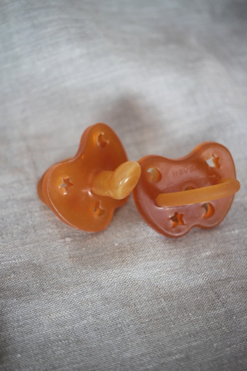 Bitte beachten Sie! Hevea Schnuller bestehen zu 100 % aus Naturkautschuklatex, der mit der Zeit nachdunkelt.
