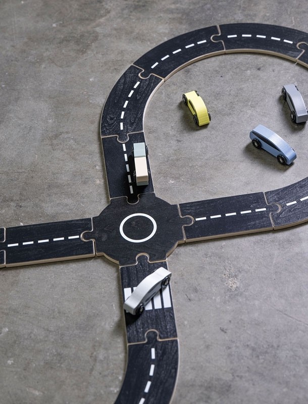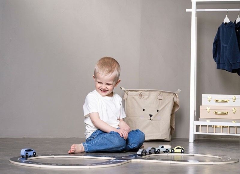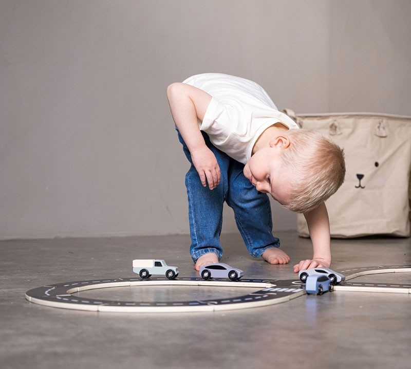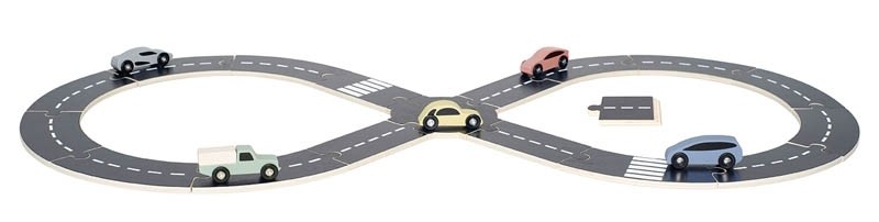 Hier stehen 5 Autos bereit zum Start, um als schnellstes die Strecke zu umrunden. Diese Autorennbahn aus Holz von Jabdabado ist ein Muss für autoverrückte Kids. Die Streckenabschnitte sind zweispurig, damit man sie auf verschiedene Arten zusammenlegen kann und seiner Kreativität freien Lauf lassen kann. Die Autorennbahn ist perfekt für kleine Hände, beim Bauen und Spielen werden die motorischen Fähigkeiten geschult. Die Rennstrecke kann auch mit dem Parkhaus von Jabadabado kombiniert werden.