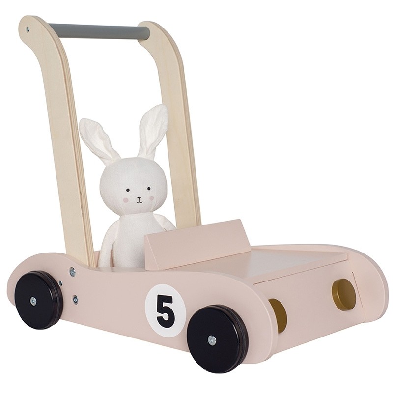 Der Baby Walker Bunny ist der perfekte Begeiter für die ersten Schritte. Er ist wie ein kleines Auto designt und das beliebte Stofftier Hase sitzt schon bereit, um mit dir zu kleinen Abenteuern aufzubrechen. Der Baby Walker bietet eine stabile und sichere Stütze selbst für die Kleinen, die gerade erst angefangen haben, zu laufen, denn es sind an den Hinterrädern einstellbare Bremsen angebracht. Ein kleines Fach als perfektes Versteck für deine liebsten Spielzeuge befindet sich unter der “Motorhaube”, die abgenommen werden kann. Die hübsche Pastellfarbe macht den Baby Walker zu einem tollen Detail im Kinderzimmer. Die Räder haben Gummiringe, so dass sie sicher über alle Oberflächen rollen können, ohne Spuren zu hinterlassen. Der Baby Walker wird ein geschätztes Geschenk zum Geburtstag oder der Taufe sein, mit dem über viele Jahre gespielt werden kann.