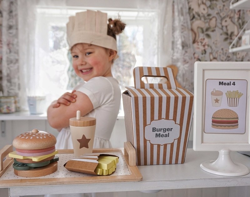 • Burger-Spielset mit Take-Away-Box und stapelbarem Burger