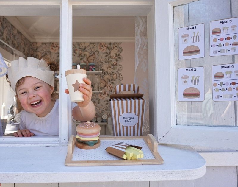 Ein komplettes Hamburger Menü für Kids mit großem Hunger! Serviere viele leckere unterschiedliche Hamburger Menüs wie auf den beigefügten Menükarten vorgeschlagen. Der Hamburger ist zum Stapeln, so dass die Kinder wählen können, was sie auf ihrem Hamburger haben möchten. Die 4 Menükarten sind Vorschläge für die Burgerkombinationen mit Pommes Frites und einem Getränk. Das Set enthält 1 Take-Away-Box, 1 stapelbarer Hamburger mit Brötchen, Gurke, Burger, Käse, Tomate und Salat sowie 1 x Pommes Frites und 4 Menükarten.