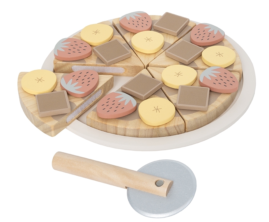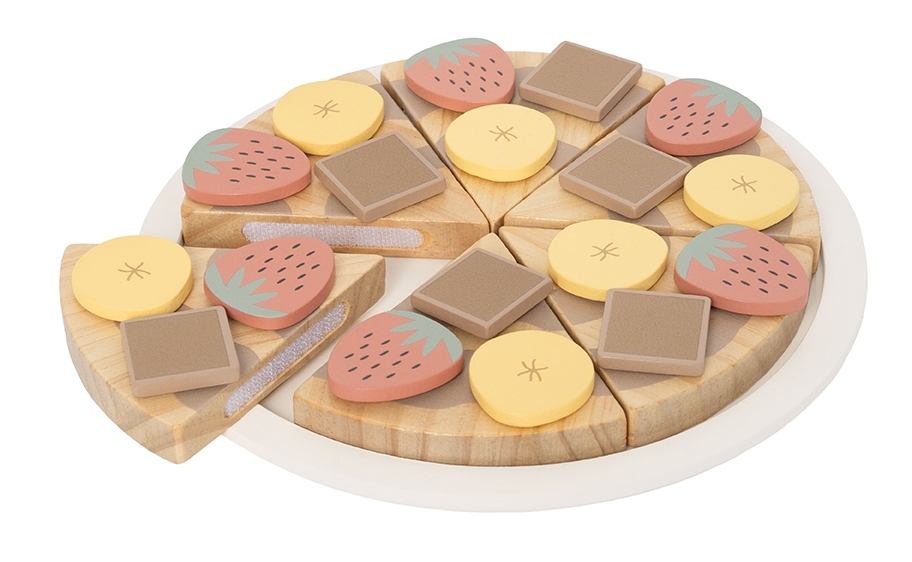 Mit dieser fantasievollen Dessert-Pizza wird jede Spielküche zur Patisserie! Kinder ab 2 Jahren können ihre eigene Pizza kreieren – belegt mit Erdbeeren, Bananenscheiben und Schokostückchen. Das Set besteht aus sechs Pizzastücken, die mit dem beiliegenden Holzschneider geteilt und serviert werden können – an Freunde, Geschwister oder Kuscheltiere.