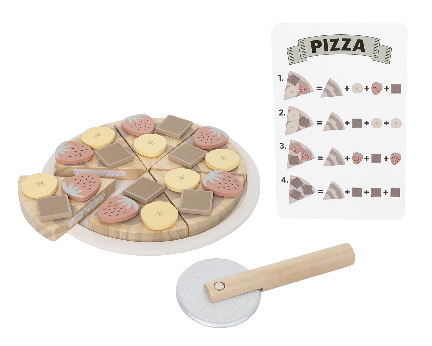 Inhalt: 6 Pizzastücke, 6 Erdbeeren, 6 Bananenscheiben, 6 Schokostücke, 1 Pizzaschneider, 1 Menükarte