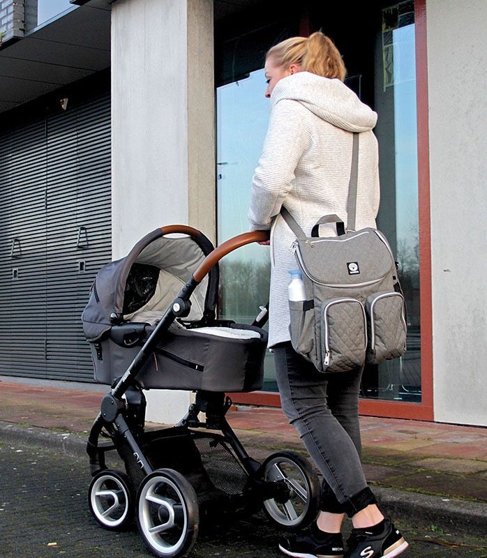 Dieser Rucksack kann durch seinen zeitlosen Chic auch nach der Wickelphase weiter benutzt werden. Eine wasserabweisende Wickelunterlage gehört zur Grundausstattung, ebenso wie die beiden Befestigungsschlaufen für den Kinderwagen.