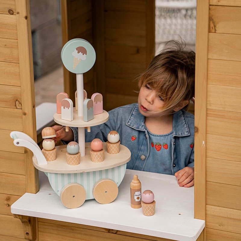 Dieser liebevoll gestaltete Eiswagen aus Holz begeistert kleine Eisverkäufer:innen mit vielen fantasievollen Spielmöglichkeiten. Ob am Tisch oder auf dem Boden – dank der leichtgängigen Räder 🛞 lässt sich der Wagen überall hinrollen, wo hungrige Gäste warten.