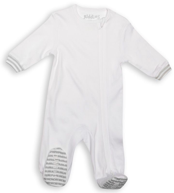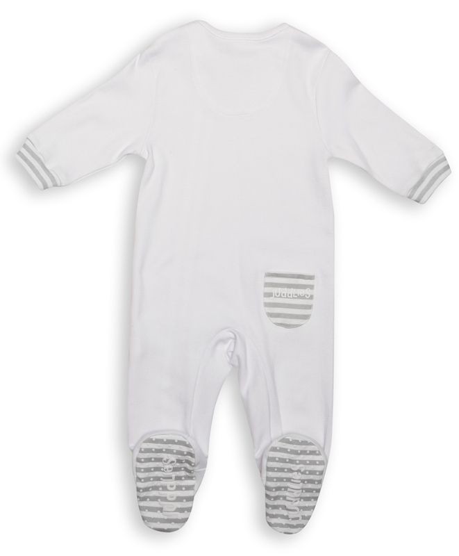 Der bequeme Strampler mit Füßen von Juddlies aus der Essential Collection bietet rundum einen hohen Tragekomfort. Durch die weiche, anschmiegsame und leicht elastische Baumwolle eignet sich der Strampler hervorragend als Schlafbekleidung aber auch als Einteiler für ein Tagesoutfit. Praktisch für ein schnelles An- & Ausziehen ist der durchgehende Zwei-Wege-Reißverschluss vom Hals bis zum Fuß. Zum Schutz der zarten Babyhaut, ist dieser am Hals unter weichem Stoff verdeckt. Ein großzügiger gerader Schnitt ermöglicht ausreichend Bewegungsfreiheit und Platz zum Wachsen. Mit dem zarten Weiß und grauen Akzenten, ist der Strampler klassisch im Desgin und somit nie aus der Mode. Sobald der Nachwuchs stehen oder laufen kann, sorgen Anti-Rutsch-Noppen unter den Füßlingen für ausreichend Halt.