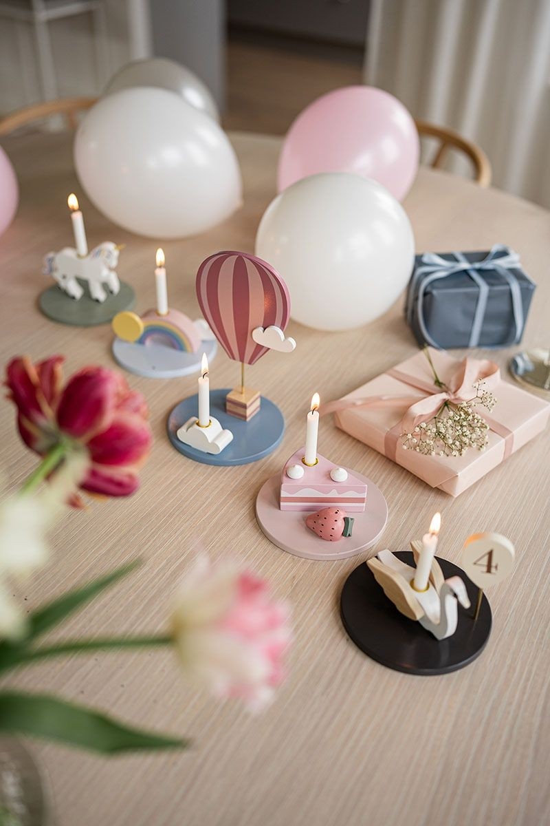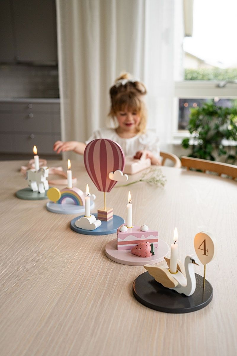 Happy Birthday! Dekorieren Sie für einen stimmungsvollen Geburtstag den Tisch mit diesem bezaubernden Geburtstagszug von Jabadabado und lassen Sie ihn zu einer schönen Tradition bei zukünftigen Geburtstagen werden. Der Zug besteht aus fünf Kerzenhaltern, die zusammen als Zug oder einzeln platziert werden können. Der Schwan führt den Zug an, gefolgt von den weiteren hübschen Figuren Regenbogen, Heißluftballon, Geburtstagskuchen und Einhorn. Die Zahlenballons mit den Nummern 0-9 sind in der Box enthalten und können auf jedem Kerzenhalter befestigt werden, um damit das Alter des Kindes anzuzeigen. Der Geburtstagszug ist in einer exklusiven Geschenkbox verpackt und er ist ein ideales und geschätztes Geschenk für die Taufe oder den ersten Geburtstag. Aus FSC-zertifiziertem Holz gefertigt. Die Kerzen sind nicht im Lieferumfang enthalten.