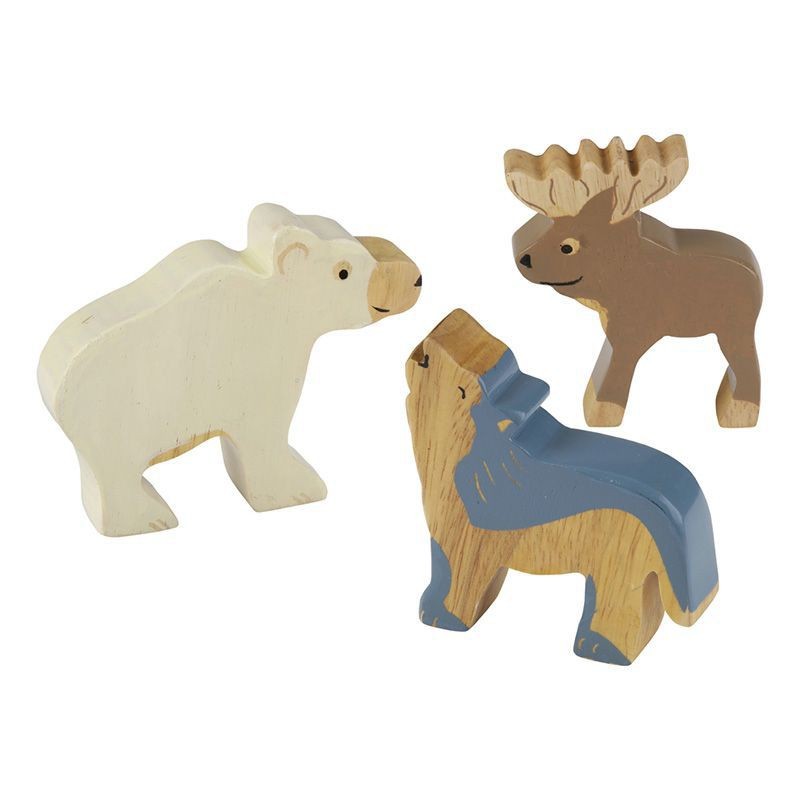 Das 3-teilige Holztier-Set Tiere der Arktis besteht aus Eisbär, Elch und Wolf. Das Set ist eine schöne und nachhaltige Geschenkidee für Kinder. Hergestellt aus Fairtrade-Kautschukbaumholz, handgefertigt und handbemalt – jedes Tier ein Unikat – genauso wie in der Natur.