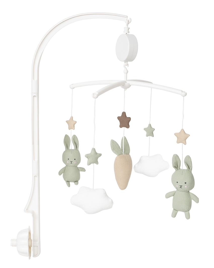 Das süße Mobile Bunny / Grün mit niedlichen Hasen, Sternen, Wolken und einer kleinen Karotte sorgt für entspannte Momente beim Einschlafen oder Wickeln. Bei Aktivierung beginnt sich das Mobile sanft zu drehen und spielt das beruhigende Wiegenlied von Brahms 🎵✨