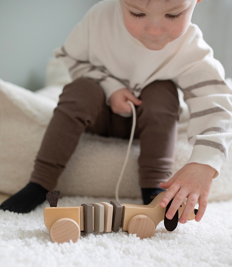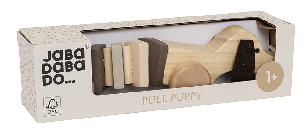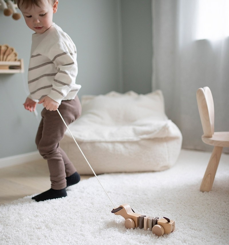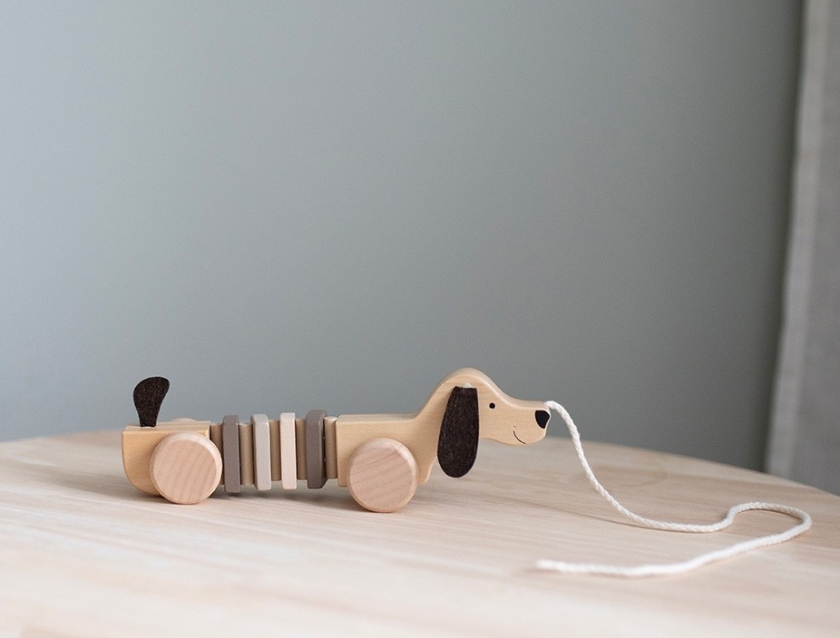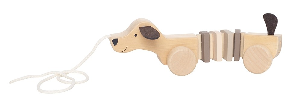 Ein niedlicher Hund als klassisches Nachziehspielzeug aus Holz, mit dem dein Kind liebend gern spazieren gehen wird. Mit den robusten Rädern aus Holz lässt sich der Hund leicht ziehen. Das Spielzeug hilft Kindern, das Gleichgewicht und die Hand-Auge-Koordination zu entwickeln.