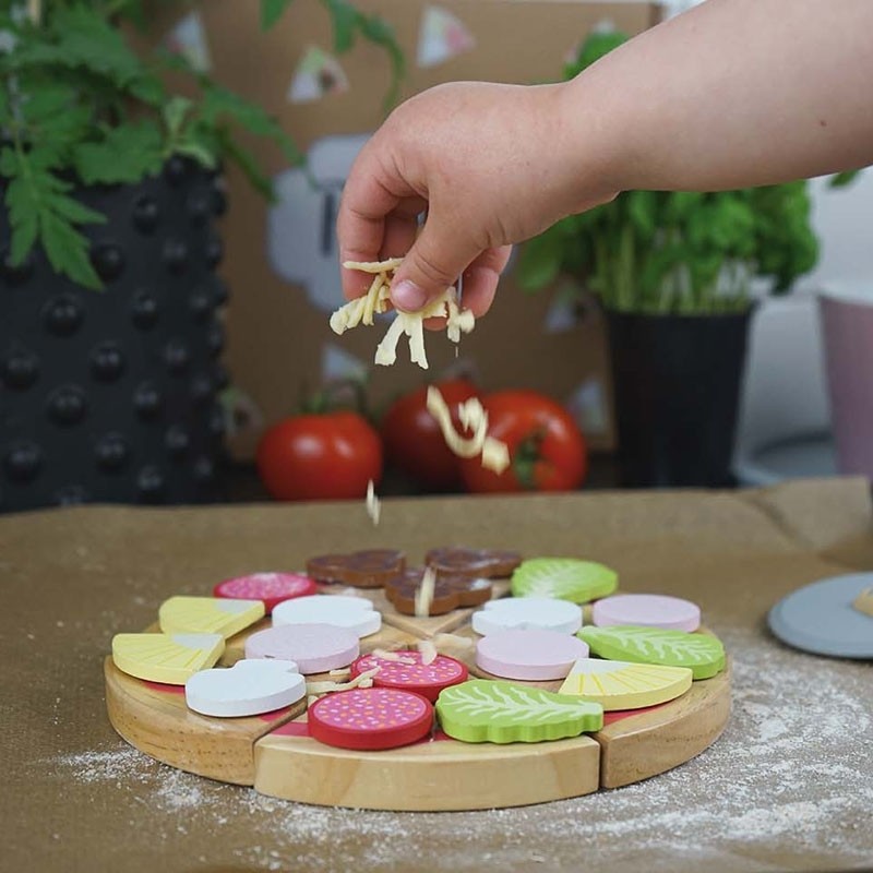 Was gibt es besseres als eine selbstgemachte Pizza! Lade deine Freunde ein, serviere ihnen eine leckere Pizza und der Abend wird ein voller Erfolg. Mit Tomatensauce und Käse als Basis, kannst du deine eigene Lieblingspizza backen. Die Pizzazutaten werden einfach mit Klett befestigt. Die 6 Pizzastücke, die mit Klett zusammengehalten werden, trennst du einfach mit dem Pizzaschneider. Serviere die Pizza auf dem Pizzateller. Guten Appetit!
