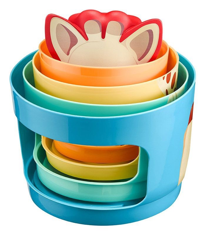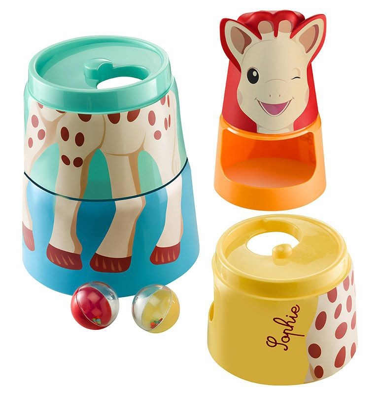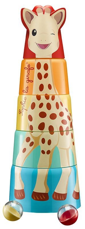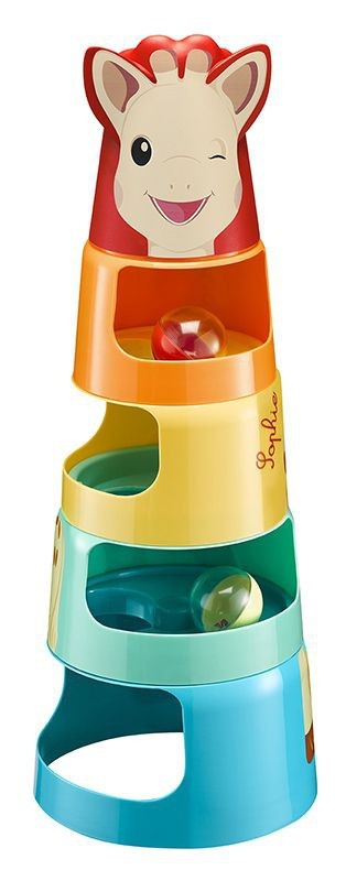 Ein Multifunktionsturm bestehend aus 5 bunten Elementen zum Stapeln, Puzzeln und Spielen mit der Kugelbahn. Ihr Baby stapelt die 5 Teile vom größten zum kleinsten, um das Puzzle von Sophie la girafe aufzubauen. Wenn alle Teile des Turmes übereinandergestapelt sind, kann es mit viel Spaß 2 große Kugeln durch die magische Rutsche rollen lassen und versuchen sie beim Herausfallen aufzufangen. Hier werden Geschicklichkeit und Feinmotorik auf besondere Weise geschult. Alles ist schnell wieder weggeräumt, da die Elemente ineinanderpassen.
