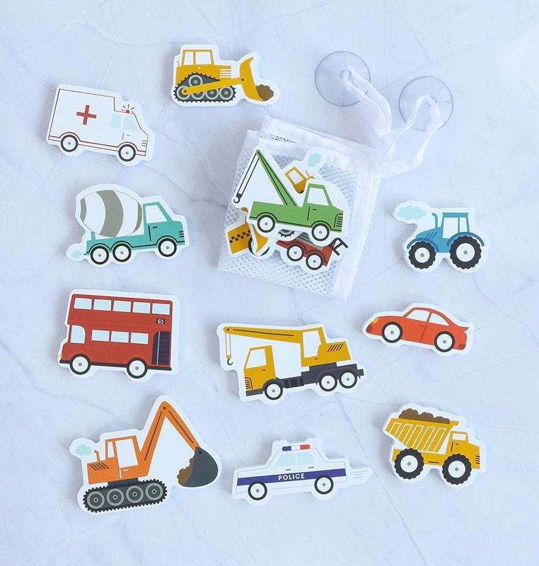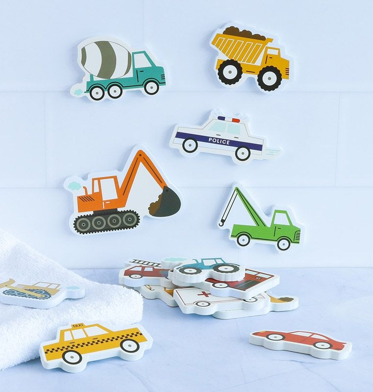 Mit dem Schaumstoff-Badespielzeug von A Little Lovely Company wird jede Badewanne zum Spielplatz. Die bunten Fahrzeug-Elemente schwimmen auf dem Wasser und haften, wenn sie nass sind, ganz einfach an Fliesen oder Badewannenrand! 🚁🚦