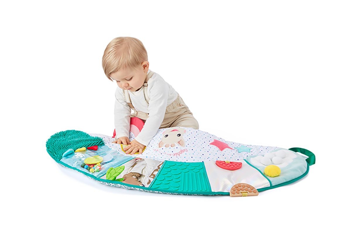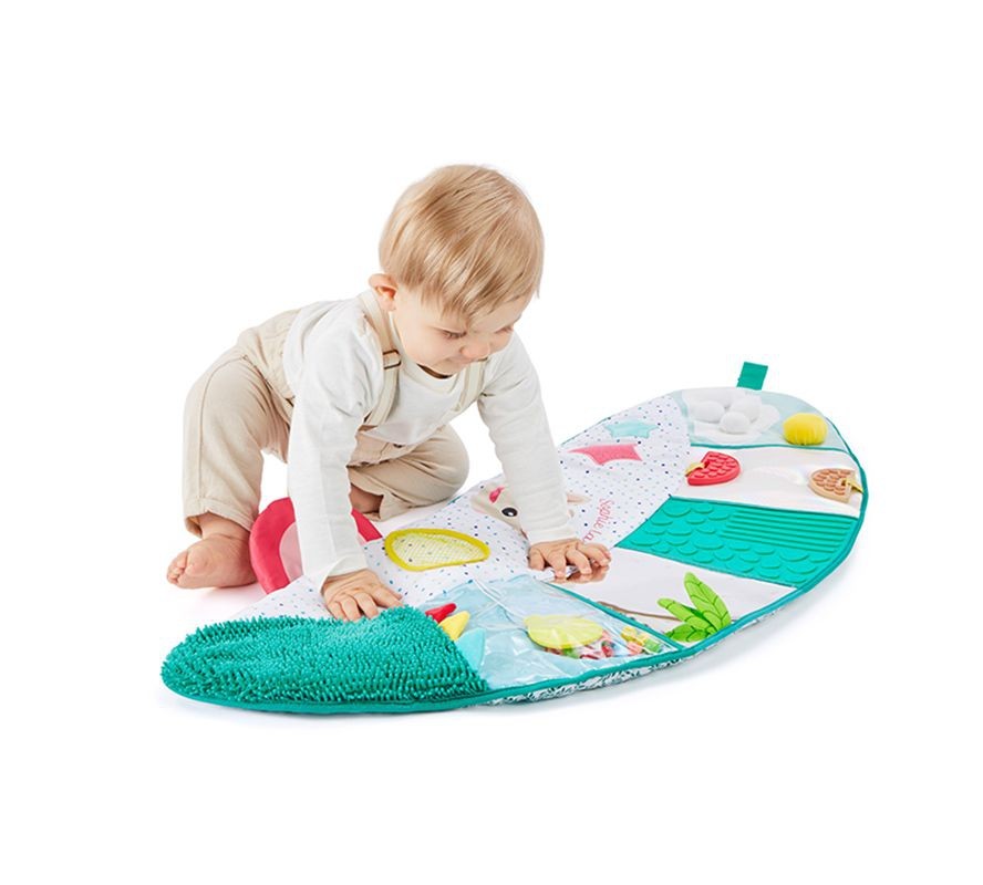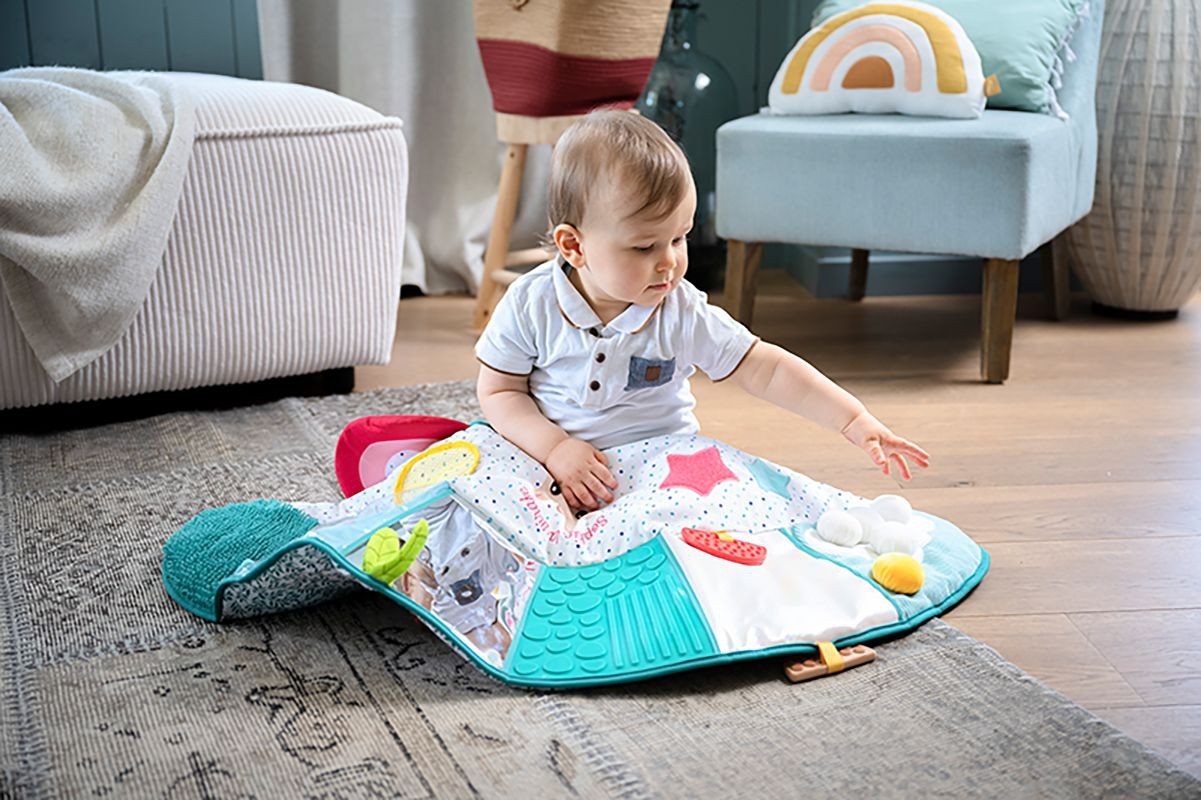 Dieser sensorische Parcours begleitet das Baby bei der Entdeckung des Tastsinns. Eine rutschfeste Matte voller spannender Aktivitäten, die dem Nachwuchs ein reichhaltiges sensorisches Erlebnis bieten. Jede Textur und jedes Muster regt zum Erkunden und Staunen an. Weich, flauschig und mit anregenden Reliefs: jedes Element der Matte wurde sorgfältig ausgewählt, um die sensorische Entwicklung des babys zu bereichern. Dank sseines griifs lässt such die prakztische Spielmatte überallhin mitnehmen. Über 16 verschiedene Texturen laden zum Entdecken ein.