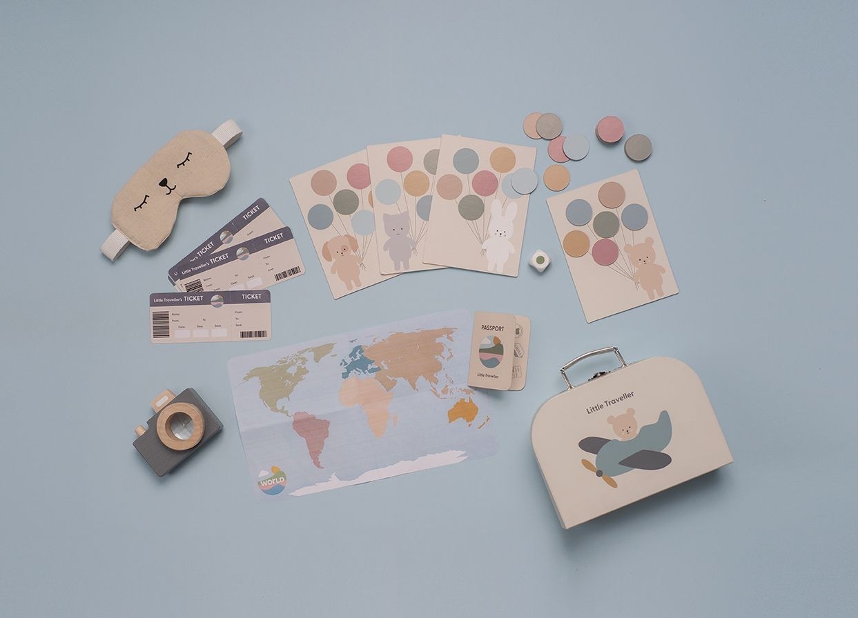 • Enthält Pass, Kamera, Fahrkarten, Weltkarte und Würfelspiel