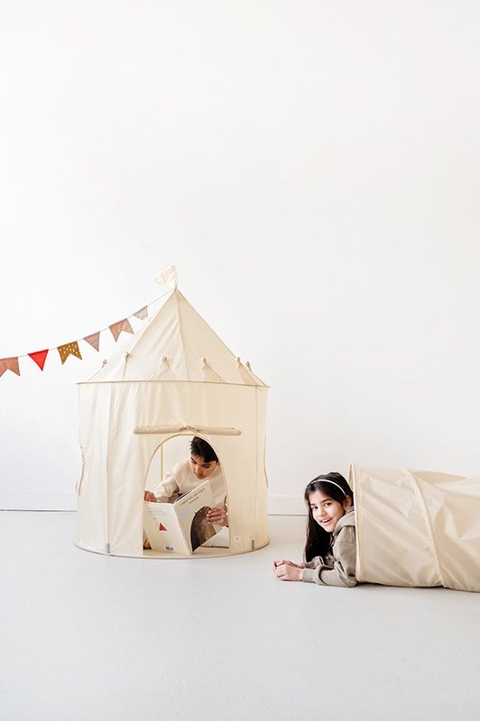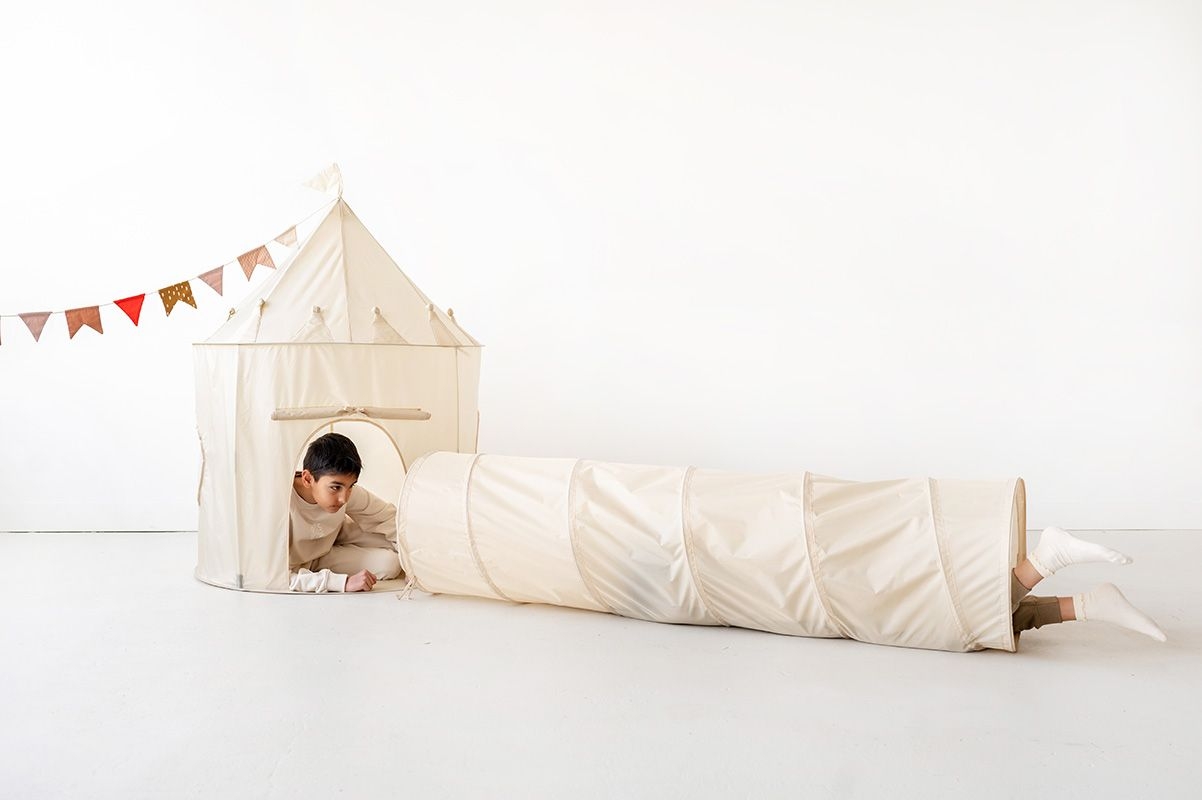 Pop-up Spieltunnel in sanftem Beige – aus 100 % recyceltem Polyester. Fördert spielerisch Motorik & Fantasie. Schnell aufgebaut, platzsparend verstaut.